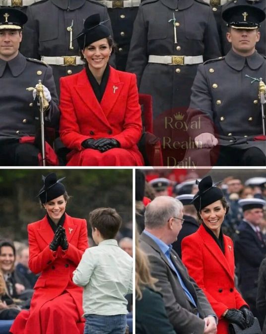 Catherine, the Princess of Wales, chose an outfit that perfectly captured the spirit of the occasion. She wore a striking ensemble in red and black, colors that directly nod to the Welsh flag, featuring the iconic red dragon on a black and green field, though red and black often represent national pride in Welsh contexts. The bold red element evoked the vibrant energy of Wales, while the black accents added elegance and sophistication. Her look was both stylish and thoughtful, blending royal poise with cultural respect. Details like accessories and the overall coordination highlighted her signature attention to meaningful fashion choices that honor the host nation or regiment.
